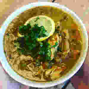 1 whole raw chicken (you can cheat and use a pre purchased BBQ chook, you'll just need to keep it hot until its ready to go into the broth for food safety reasons)