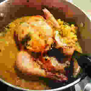 Place on a greased baking tray and pop in the oven for approx 1 1/2hrs depending on weight of your chicken. Chicken is cooked when a skewer is inserted into the thickest part (usually the breast) and juices run clear. You DO NOT want to overcook as the chicken will continue to cook once placed into the broth mixture